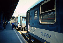 が、しかし自分の乗る列車が見あたらない・・・、 正確には案内板(パタパタなるヤツ)には出てるには出てるんだけど 何番線かそこだけ出てないの・・・。 不安になってるとほかの人がそのうち出てくるから、待ってなさいと・・・。 でも、発車時刻が近くなってドンドン表示は上のほうに行けどいっこうに乗り場が・・・ で、一番上まで行ったのにまだでてこない・・・。 ど、どうなっちまうの自分・・・。 しばらくして十分遅れって表示がでて、さらに時間を置いてやっと何番線か表示がでてきた。 と、周りにいた人達みんな移動。 みんな待ってたらしい(笑) で、ほっと一息とおもいきや・・・。 電車がすぐにやってきて自分の乗る車両を探していると。 なんだか三百番台の車両番号が・・・。 (自分の乗る車両は四百番台・・・) 353、354・・・と順に番号が上がっていくが、 このままでは超超大編成の列車じゃないと自分の車両なんか でてきようがない・・・、そんなこと思ってたら案の定363で終了・・・。 あら・・・(大汗) 焦りましたよ、本当に。 せっかく列車がきたと思ったのに乗る車両がないんだもの・・・。 あわててたまたま近くにいた駅員に切符を示して聞く。 すると「ウエイト。プラス、プラス」といってホーム先を指さす。 その方を見ると、なんか増結用の客車らしきものがやってくるのが見えた。 早く言ってよー。