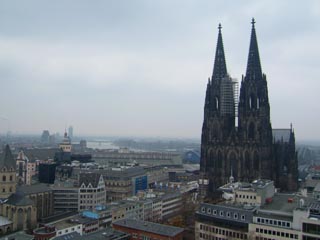 ケルンで滅多にない雪が夜の内に降った・・・、三月だというのに。 さて、この寒さの中、市街まで観光でっす。まずは定番ドーム。 ![]() でかすぎ・・・。 大きさのせいだけではないだろうけど、なにやら作るのに六百年も掛かったらしい。 そういえばフライブルグのミュンスターも何百年かかかってたような・・・。 とりあえづ、ドームは外観だけで友人我もと勤めていたテレビ局に。 余裕で警備通過、というか顔パスだった(汗) そして一般人はとうてい入ることのできない屋上へ。