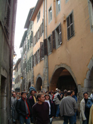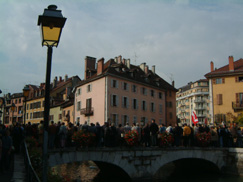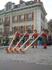 で、昼食時、一同レストランへ。 メニューが全員に行き渡る。 ギャルソン登場、みんなどんどん注文。 自分の番・・・。 わからねぇ・・・、読めねぇ・・・。 すると隣のドイツ人が英語で助け舟、 さらに目の前のイギリス人も助けてくれた・・・。 終いにはフランス語の先生が中国語で説明しだす・・・。 こうなってくると誰に何語を使って話したらいいのか混乱してくる・・・。 正確には、口が何語を話していいのかわからず停止、 脳がはるか先にいってしまったって感じ。 今回は間違っても日本語がないところが嬉しくも悲しいところ(涙) いやはや、さもありなんとて、この言語のミックス状態がですねぇ 留学の醍醐味でしてぇ・・・、ん? そして昼食もおわり祭りのパレードを見に行く。 民族衣装などをきた行列が町を練り歩いていた。