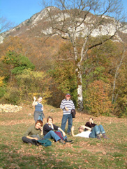 | 山歩き!! しかし、集まった生徒は五人・・・・。ははははは。 先生二人とともに総勢七名でレッツゴー!! ![]() 途中壁に素晴らしい落書きを発見、このセンス生かしてるね♪ 特に手前の青いのがいい感じね(爆) ![]() さてさて、どんどん登ります、でも本日は頂上までは行かず・・・。 途中の見晴らしの良いところで折り返し。 ![]() ま、山を歩けたのでいいのでっす♪ ![]() ----------- この日の夕食時、わけのわからん質問が・・・。 どうやらネガティブセンテンスとポジティブセンテンスの 返答に関する冗談だったらしいのだがフランス語初心者にそれは無理です。 もう、質問の意味からして真剣に考えてしまい・・・・。 結果、大混乱! いけません、留学生をからかおうと思っては! ところで、この後ここSavoie 地方の公演に行って来た。 ここはその昔、Savoie 家が支配しており(現在のイタリア・スイス・フランスにまたがる一帯) その名残から独自の文化がのこっているのでございます。