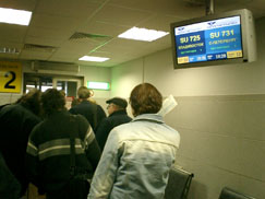 さー、元気よく家を出発! 今回から荷物運ぶキャリアを購入したので何の苦もなく駅に到着♪ で、あっという間に成田空港。 ![]() なんかもう空港だぁって言う感動がない・・・。 そのままあっさりとカウンターまで行って、 とりあえず無事に飛行機のチケットはゲット。 モスクワまではなんとか飛べる。 ![]() それにしても気になるのがカウンターのお姉さんの態度。 いやわるいとかそういうのじゃなくてやたらあっさりしていたなと・・・。 だって一度モスクワで荷物受け取ってから空港移動して乗り継ぎよ、 しかも十分に時間があるわけでわないし・・・、 こんなもんなんでしょうかね。 さてとそろそろ出国審査に行ってきます。 エックス線のチェックで引っかかった、 と言ってもフィルム用のシールドなんで毎度のことだが(笑) 無事に出国審査も過ぎ、待合室に。 マスク姿の人たちがちらほらと、 で手袋にプラスチック製の簡易マスクの人まで、 これはかなり違和感ありますな。 乗る飛行機はぁ、あれ、今回はボーイング? ![]() なんだかなぁ。映画上映は故障のため中止だってさ、 っていうかずっと壊れたまんまでしょ 直す気なんて毛頭ないでしょ、もしかしてさ(笑) ![]() さっき、税関申告書でももらおうかと思ってキャビンに 普通、飛行機に少しは積んであるんだけど・・・。 これでまたタイムロス要因が増えたってもんさぁ、 本当に現地まで行けんのぉぉぉぉ。 そて無事にモスクワ空港にほぼ定刻どおり到着。 さぁーー、難関入国審査よーー!! 列に並ぶ。 はや歩きしてきたのでかなり前のほうになった。 ついでにみんなそんなに時間かかってない。 五分ぐらいで済んでるし。 よかった、この分ならなんとか間に合うかなぁ。 そして自分の番。 カウンターに進んでパスポートを提示。 スタンプを押す音が聞こえる。 あー、よかったぁ、などと思っていると パスポートを自動読み取り機に通した瞬間、係員の反応がなんか・・・。 そしてパスポートの代わりに返ってきたのは カウンター脇を指差されて「5 minits」 という冷酷非道な英語だった・・・。 なんかビザのページに問題があったらしく、そこで待てと・・・。 こんなん絶対、五分で済むわけない・・・。 きっと2・3時間待たされるのでしょうか、しかも 最悪入国拒否・・・。 ここまできて、そんなぁ・・・。 ![]() と思っていながら待っていると 十五分ほどしてパスポートを手に係員がもどってきて 黙って渡してきてそのまま終了。 どうやら問題なかったようだ。 だからさぁ、ビザの名前の一部が数字なのは変だと思ったのだよ。 きっとあれで自動読み取り機にひっかかったんだと思います。 そして大急ぎで荷物をとり税関申告書に記入。 税関突入! 外貨持込があるから、かならずレッドチャンネル通って、 スタンプもらえってガイドブックに書いてあったのに 「No problem!」 と笑顔でいわれて終了・・・。 あら・・・。 帰りは必要最小限の現金のみ持つこととしよう、最悪没収されるから。 そしてバス用に両替をして並み居る白タクの客引きを避けながら やっとのことで乗合タクシーの乗り場に到着。 しかし、国内空港行きがない・・・。 ちょっとはなれたところにバス乗り場も見られたが 荷物が多いので乗り降りが大変そうだし、だいいち時間が結構ヤバイ・・・。 なんてしてたら時間がなくなってくる・・・。 さっきから白タクの客引きが近くにいて安く行くからとか ほらなかなか乗合タクシー来ないじゃなーいとかロシア語で誘ってくる。 試しに値段を聞いてみる。 最終的に十五ドルで合意。 (それでも乗合タクシーの三十倍の価格・・・ とはいえ散々乗り渋ったので白タク相場では安い方) しかたありません、時間も時間です。 怖かったけど、それで行く事に。 (白タクの利用は結構危険なので極力やめましょう、特に女性) 時間と初白タクにハラハラしながら十分ほどで国内線空港到着。 とっととゲート見つけてチェックイン。 噂どおり重量オーバーには厳しくて手荷物まで計らされた。 しかし、かばん一個カウンターの真下に隠してたので それは見逃され、見事に重量以内! やった! とはいえ帰りはどうすんべか・・・。 チェックインの後、すぐに搭乗口へ(本当にギリギリ)