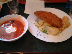 ----------- - 初街 - 行ってきました中心街。 ![]() 基本的に街の建物は中世の石造りの建物とかなのですが 独特の色使いが見事な町並みを形成しています。 天気も良くていい感じなんですが、やはり気を抜けない・・・、警察がねぇ。 ![]() 百メートル先を意識しながら歩いているととっても気疲れします。 ついでにネオナチなんかの集会に当たらないように 最新の注意を払わなければいけません。 本屋を巡った後に食事。 自分何も分からなくて一緒に行った友人に一緒に注文してもらった(笑)